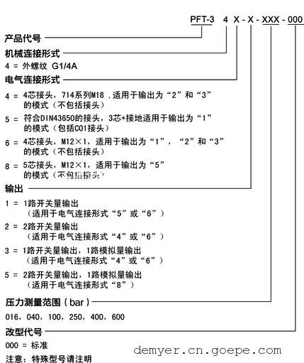 天津德米尔PFT-344-2-250-000电子压力继电器 25mpa开关量 4-20ma压力开关,集压力测量,显示,输出、控制为一体的压力控制元件。该元件除可直接测量压力值外,还可根据现场使用要求自带一个开关量或两个开关量输出、以及一个4-20mA模拟量信号输出,其中,开关点以及相应的延滞时间可以通过触摸式按键调节设定,4-20mA模拟量输出可直接连接PLC或者DCS系统,实现远程监测控制。产品精度高,操作简单,安全可靠。